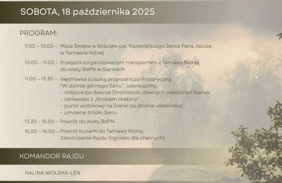 Zapraszamy również na zakończenie sezonu turystycznego 18 października 2025 r. w dolinie Górnego Sanu. Msza Święta o godz. 9:00 w Tarnawie Niżnej. Przejście na szlaku Bukowiec – Sianki – źródła Sanu. Wyjście na szlak organizowane będzie we współpracy z BdPN i PTTK Ustrzyki Dolne.